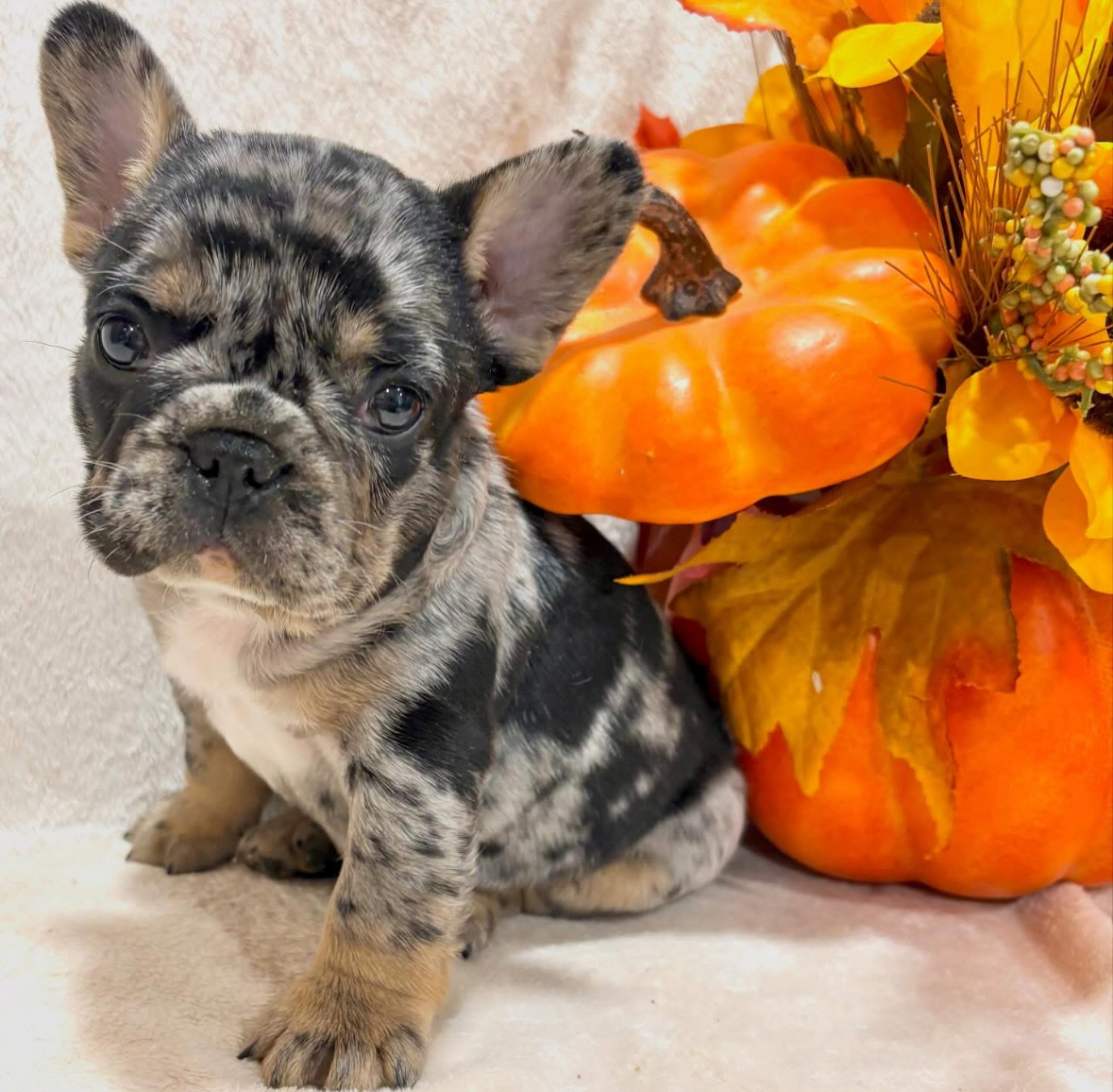 Candy Corn is 4 weeks old. She is a black and tan merle French Bulldog. She is very sweet and spunky! She would fit in perfectly with any family. Her parents are both health clear and OFA certified. Her dad is Porter, one of our studs. She comes with a one year health guarantee. She is ready for her forever home 12/14/25!