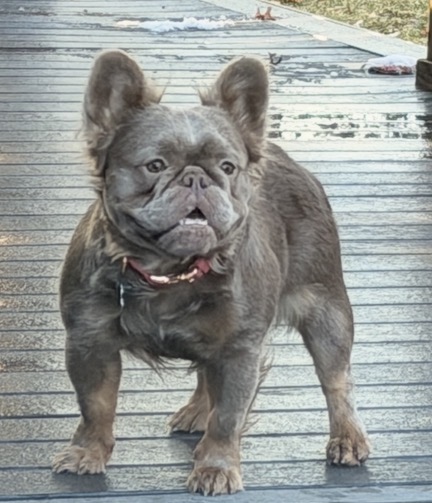 Meet Evie! Evie is a beautiful fluffy blue and tan French Bulldog. Her temperament is very friendly and playful yet laid back, she also likes to snuggle with anyone. She is very well socialized and is great with kids and other animals; as she lives with both. She has a 9.5″ back and is 24 lbs. She is 6 panel health clear. She is OFA certified with good hips, grade 0/0 patellas, and normal elbows, heart, and eyes.